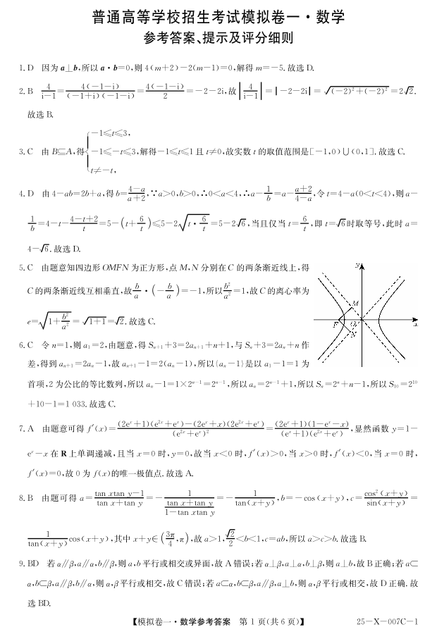 河南省新高中创新联盟2025届高三模拟卷一 数学答案.pdf