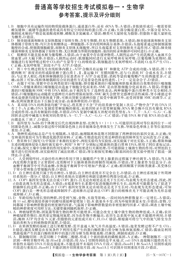 河南省新高中创新联盟2025届高三模拟卷一 生物答案.pdf