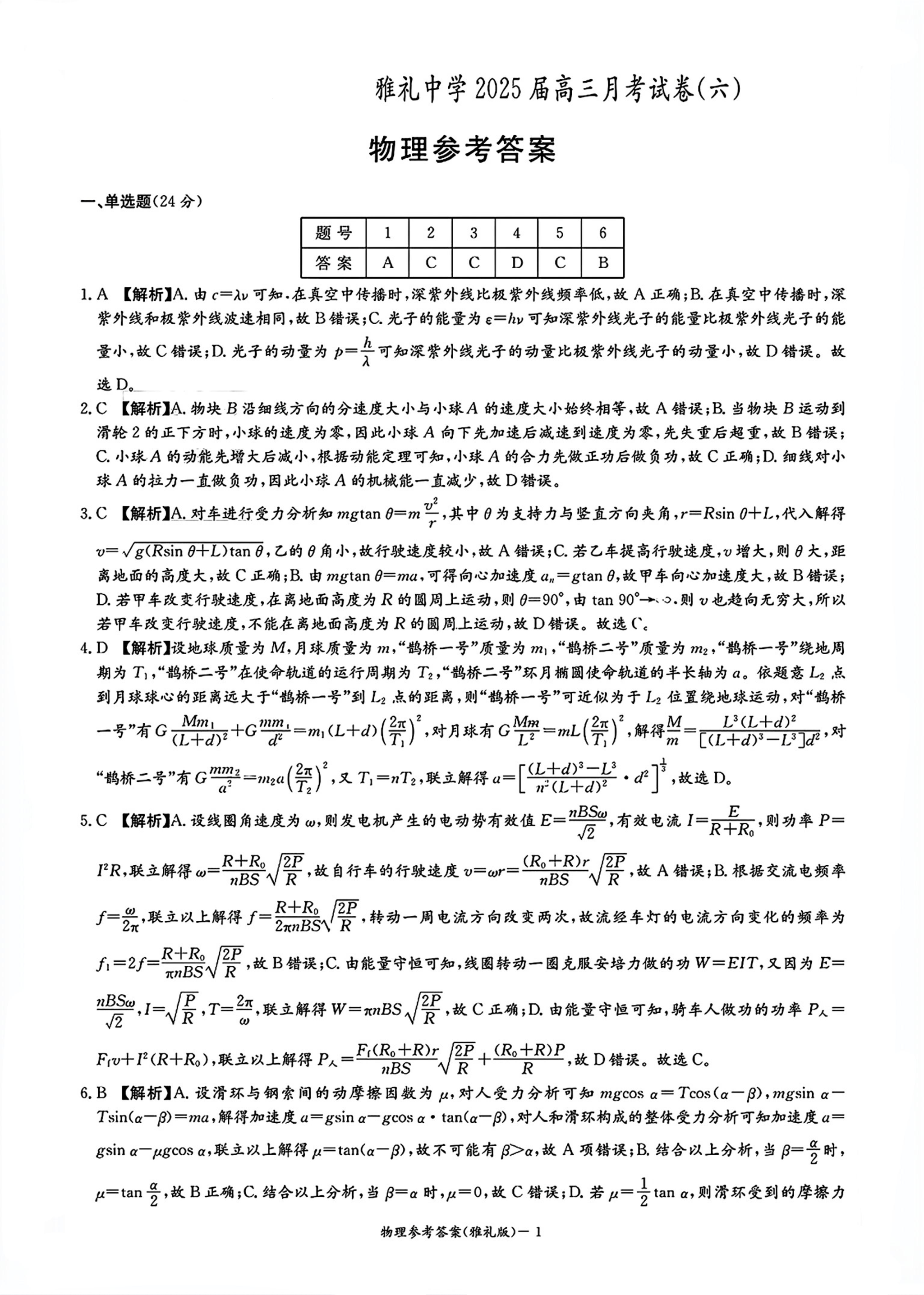 湖南省雅礼中学2025届高三月考试卷(六)物理答案.pdf