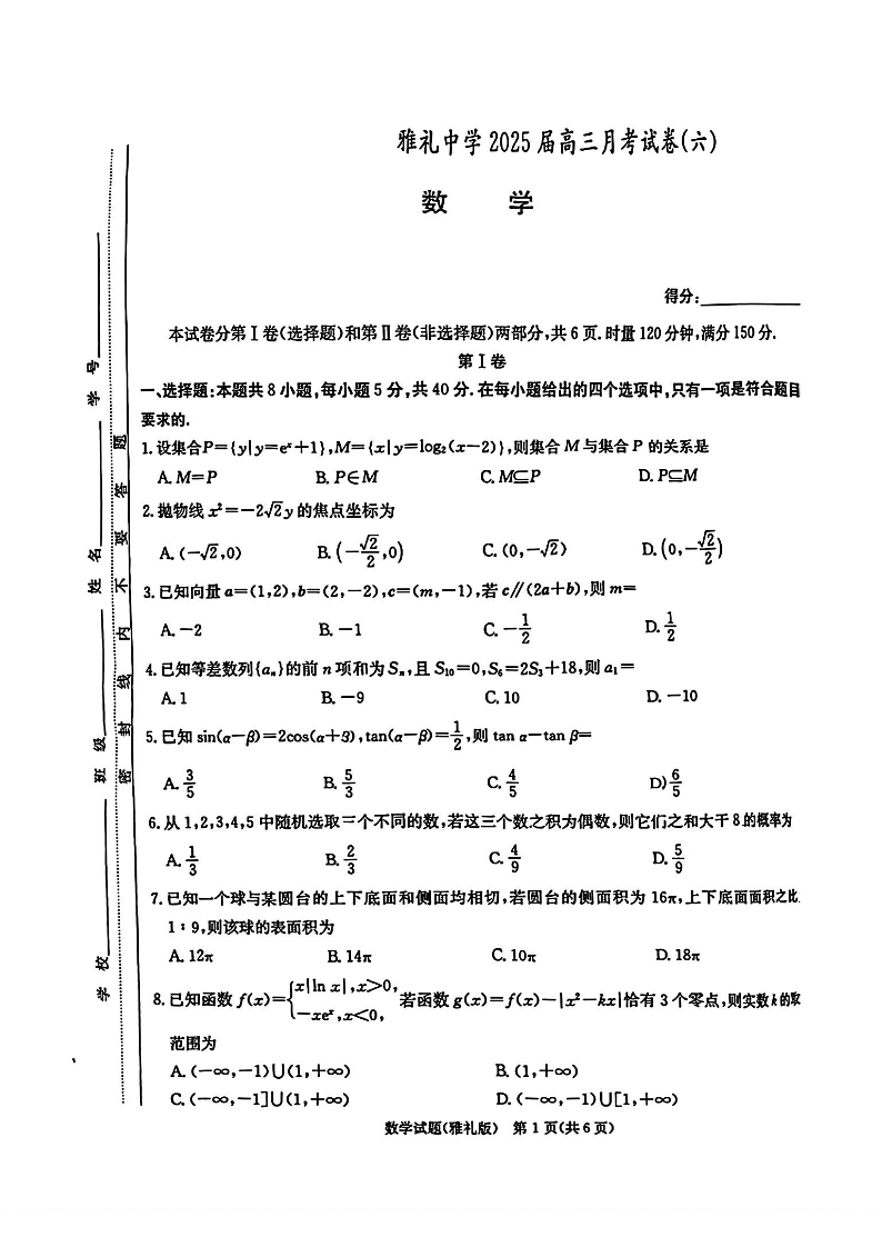 湖南省雅礼中学2025届高三月考试卷(六)数学.pdf