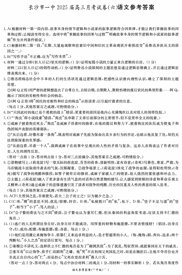 湖南省长沙市一中2025届高三月考试卷(六)语文答案.pdf