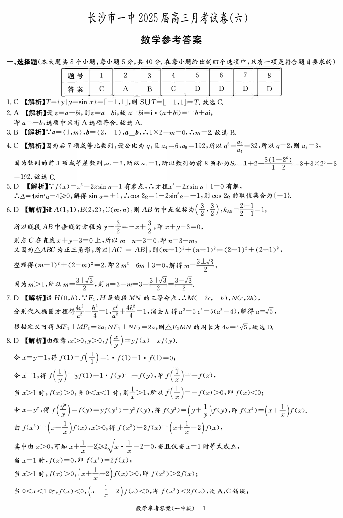 湖南省长沙市一中2025届高三月考试卷(六)数学答案.pdf