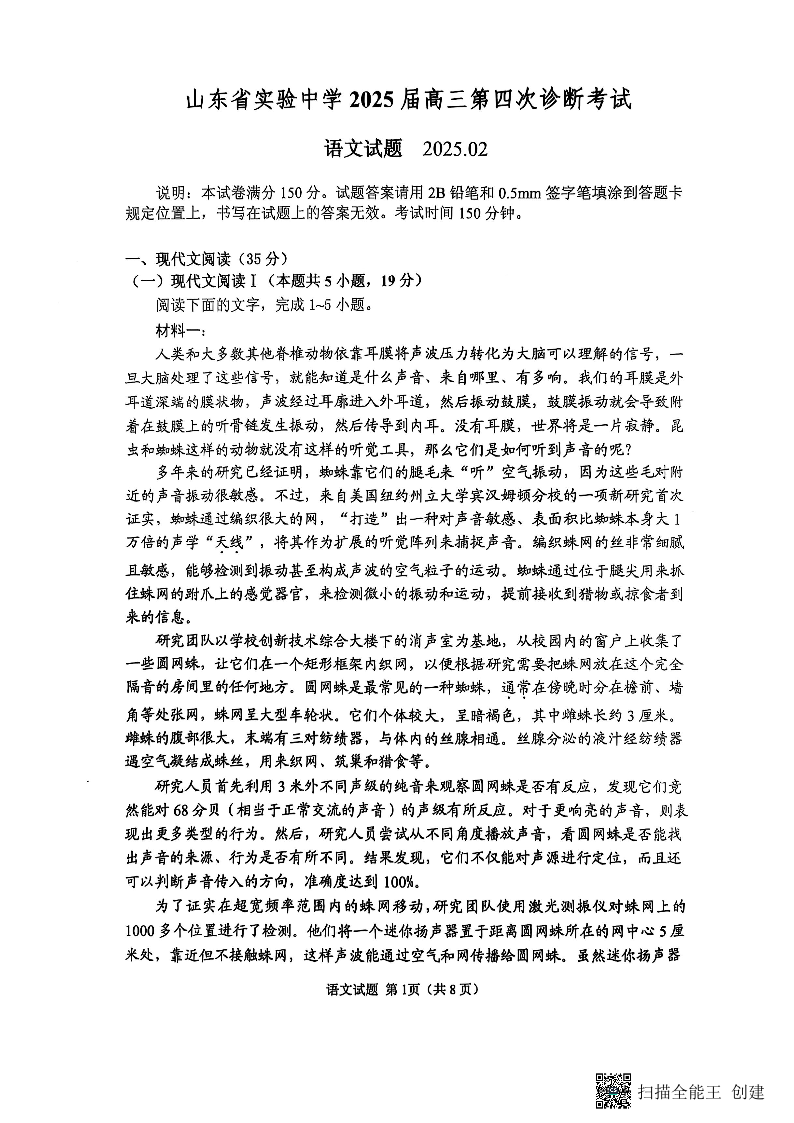 山东省实验中学2025届高三第四次诊断考试 语文.pdf