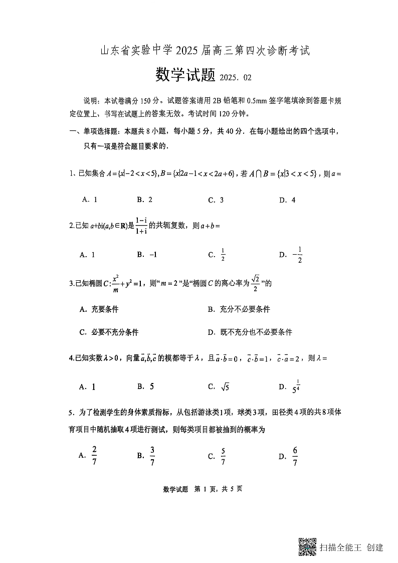 山东省实验中学2025届高三第四次诊断考试 数学.pdf