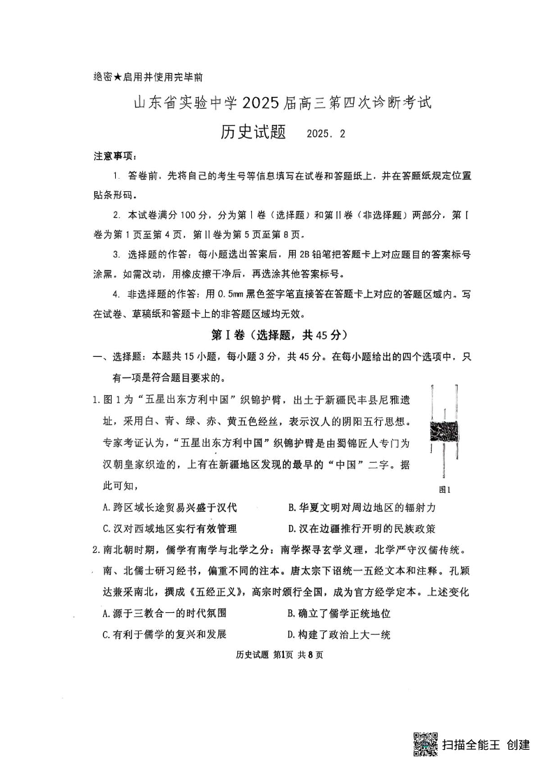 山东省实验中学2025届高三第四次诊断考试 历史.pdf
