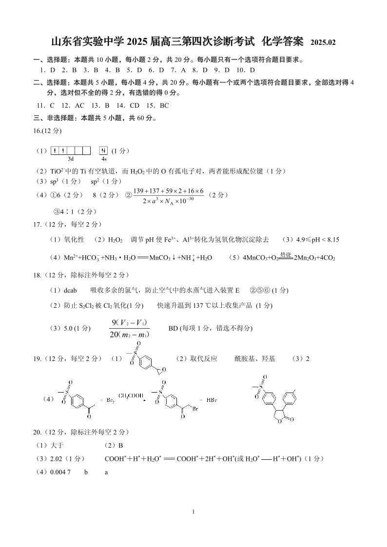 山东省实验中学2025届高三第四次诊断考试 化学答案.pdf