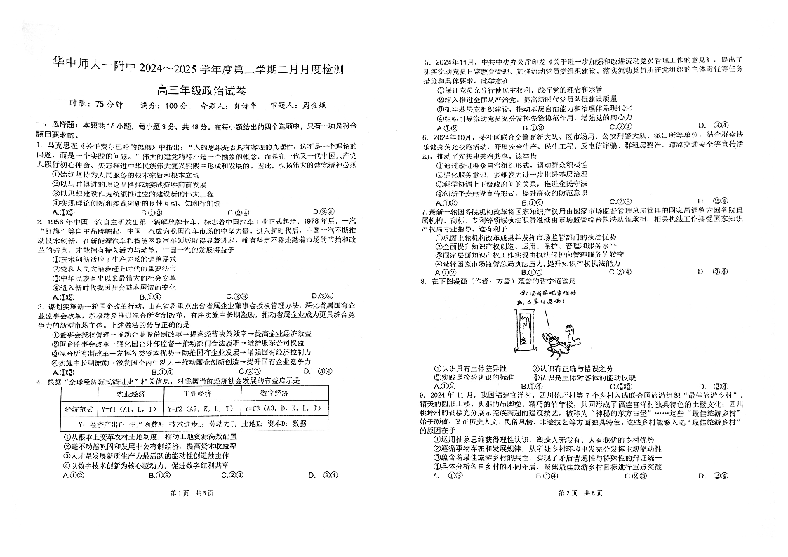 华中师大一附中2024-2025学年度高三下学期二月月度检测 政治.pdf