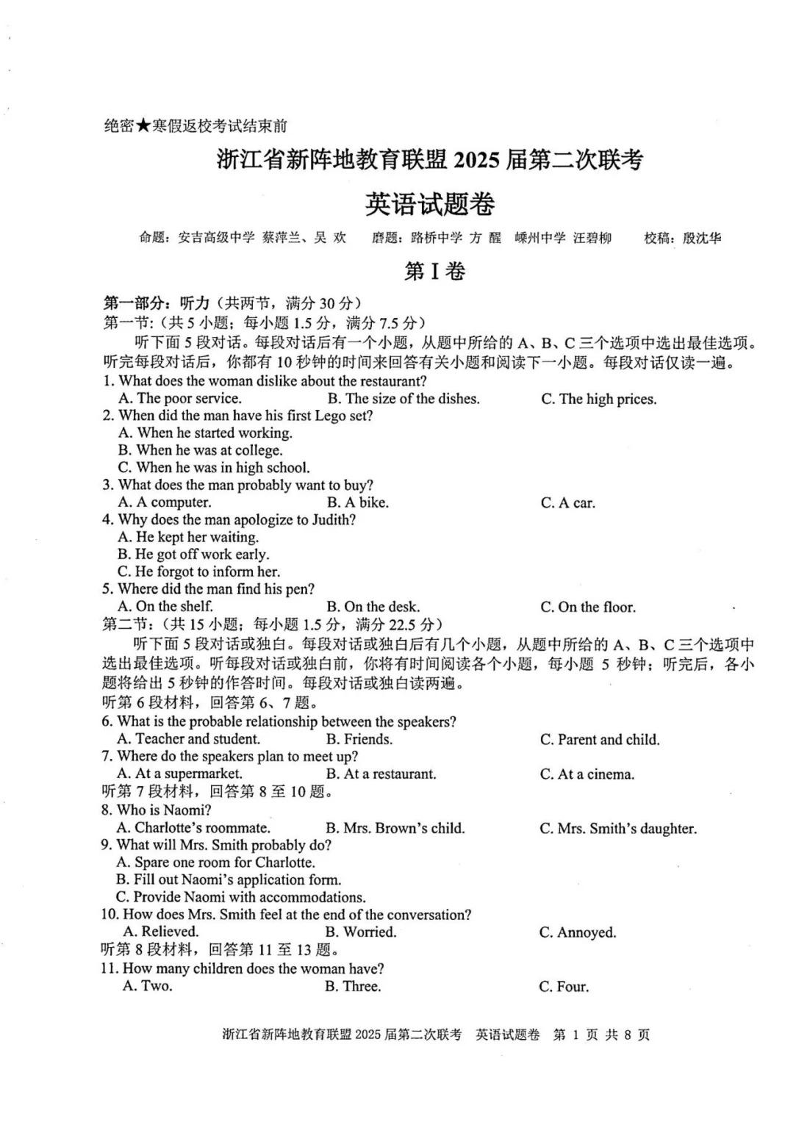 浙江省新阵地教育联盟2025届高三第二次联考 英语试卷及答案.pdf