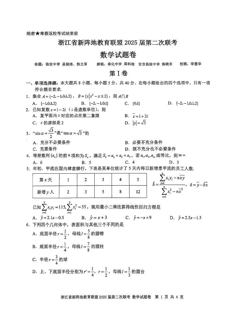 浙江省新阵地教育联盟2025届高三第二次联考 数学试卷及答案.pdf