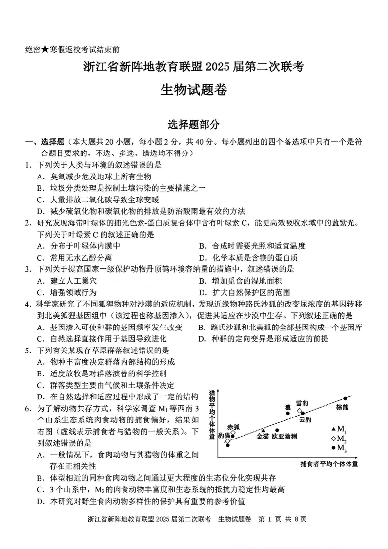 浙江省新阵地教育联盟2025届高三第二次联考 生物试卷及答案.pdf