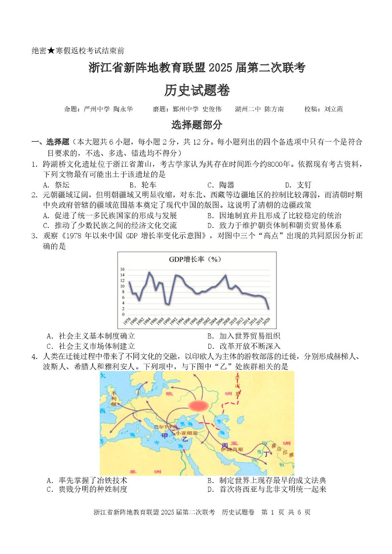 浙江省新阵地教育联盟2025届高三第二次联考 历史试卷及答案.pdf