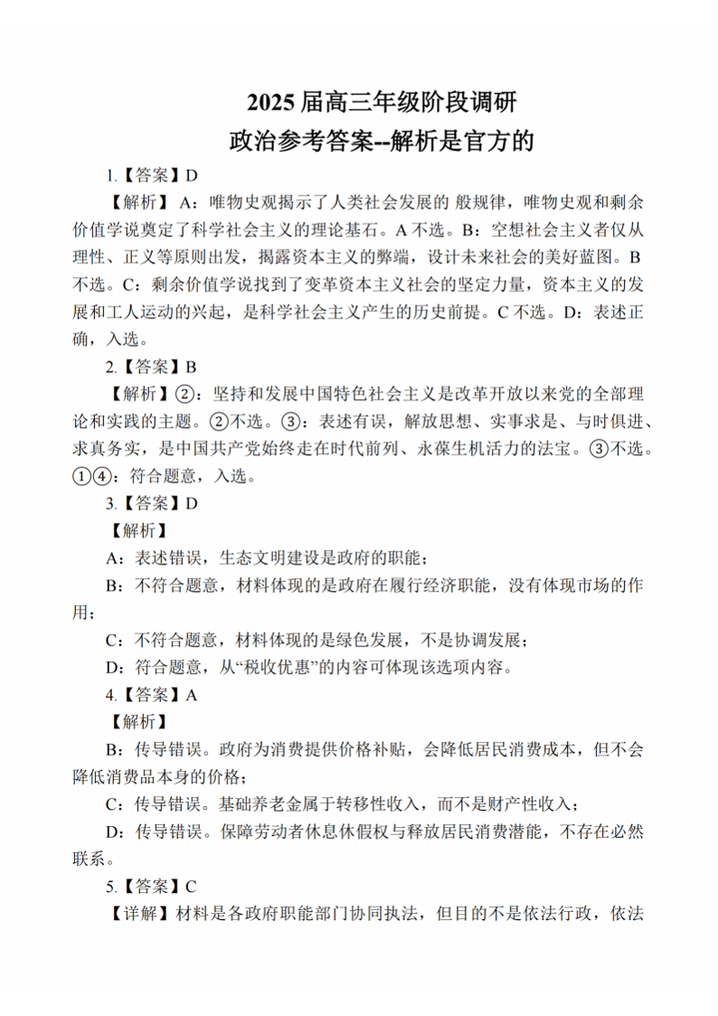 江苏省G4联考2025届高三年级2月阶段调研 政治答案.pdf