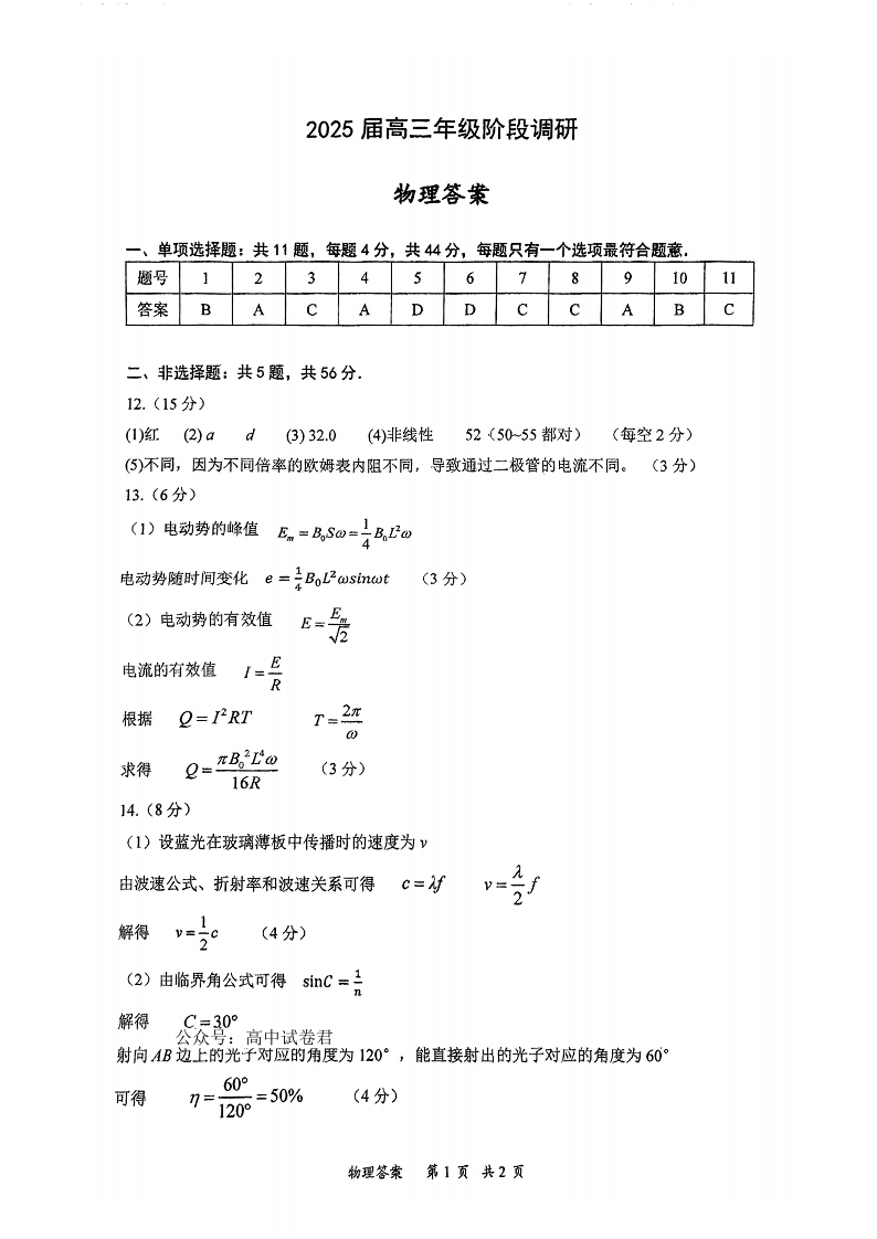 江苏省G4联考2025届高三年级2月阶段调研 物理答案.pdf