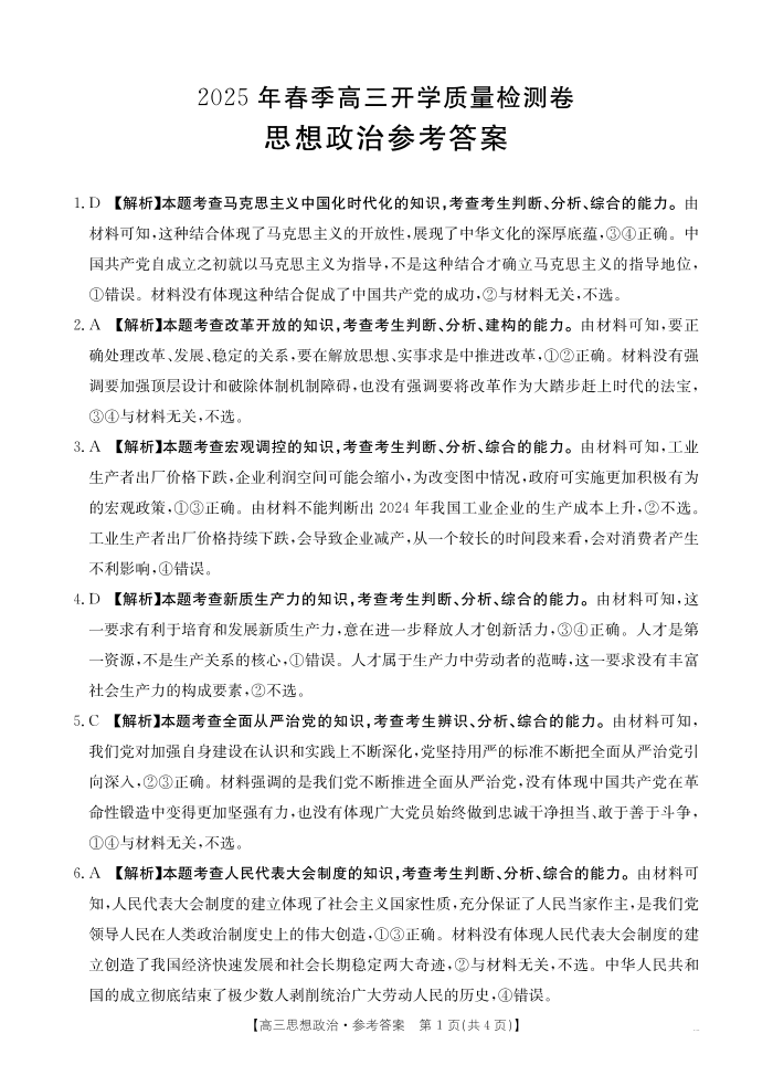 广西壮族自治区桂林2025届高三春季开学质量检测卷 政治答案.pdf