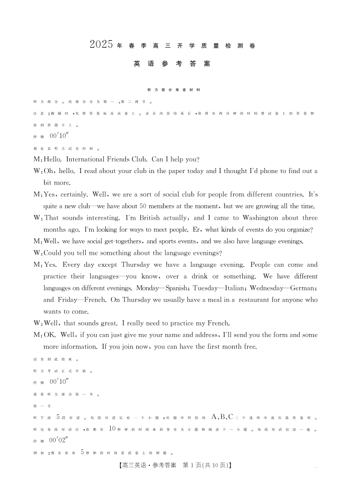 广西壮族自治区桂林2025届高三春季开学质量检测卷 英语答案.pdf