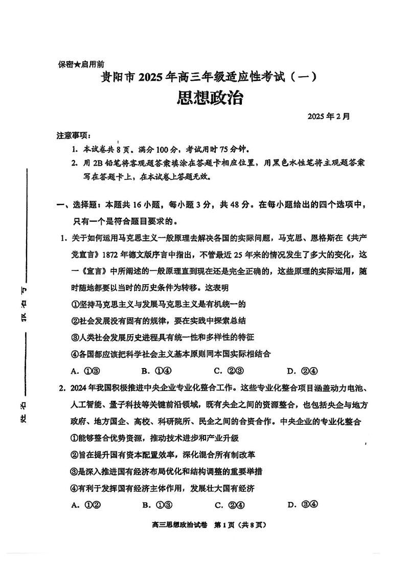 贵州省贵阳市2025年高三年级适应性考试(一)政治.pdf