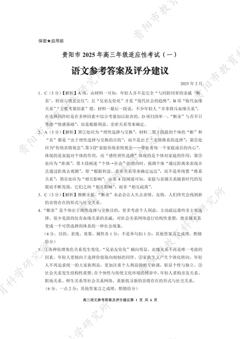 贵州省贵阳市2025年高三年级适应性考试(一)语文答案.pdf