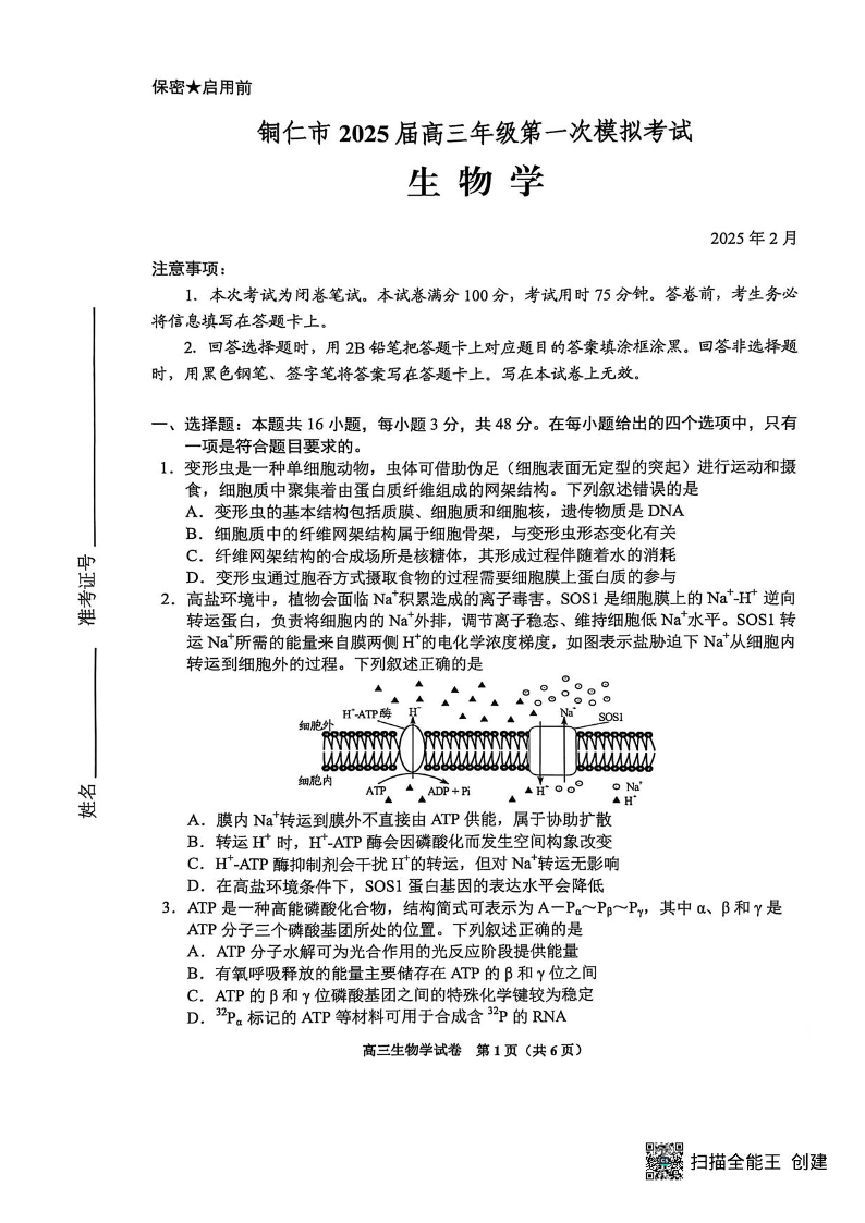 贵州省贵阳市2025年高三年级适应性考试(一)生物.pdf