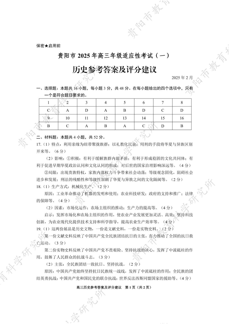贵州省贵阳市2025年高三年级适应性考试(一)历史答案.pdf
