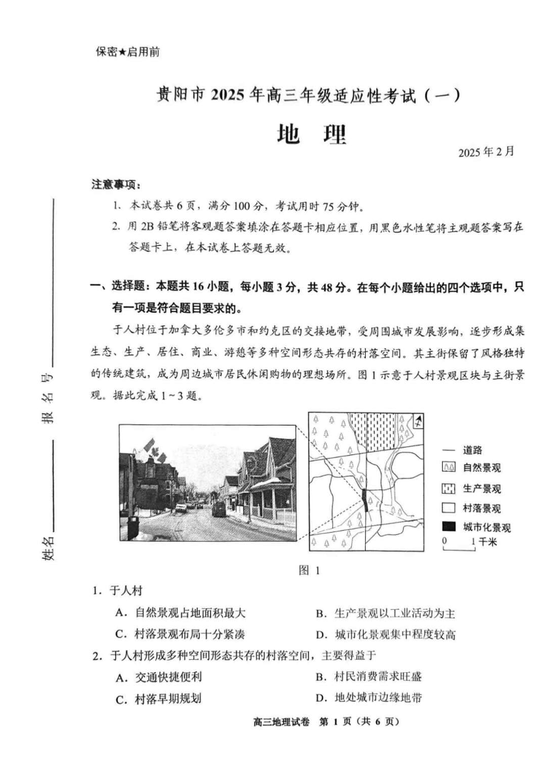 贵州省贵阳市2025年高三年级适应性考试(一)地理.pdf