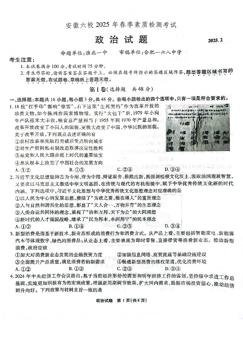 安徽省六校2025届高三下学期2月素质检测考试 政治.pdf