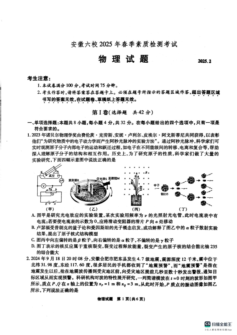 安徽省六校2025届高三下学期2月素质检测考试 物理.pdf
