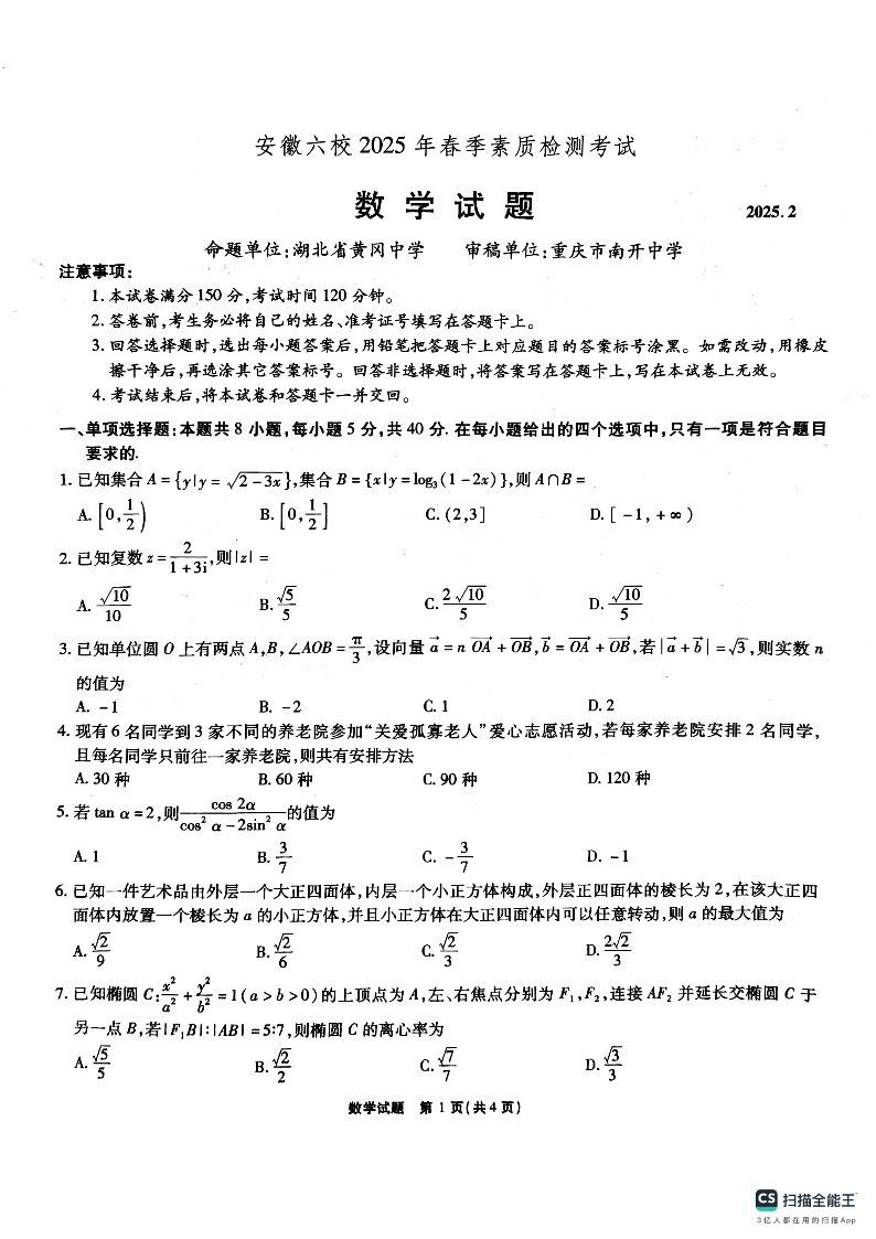 安徽省六校2025届高三下学期2月素质检测考试 数学.pdf