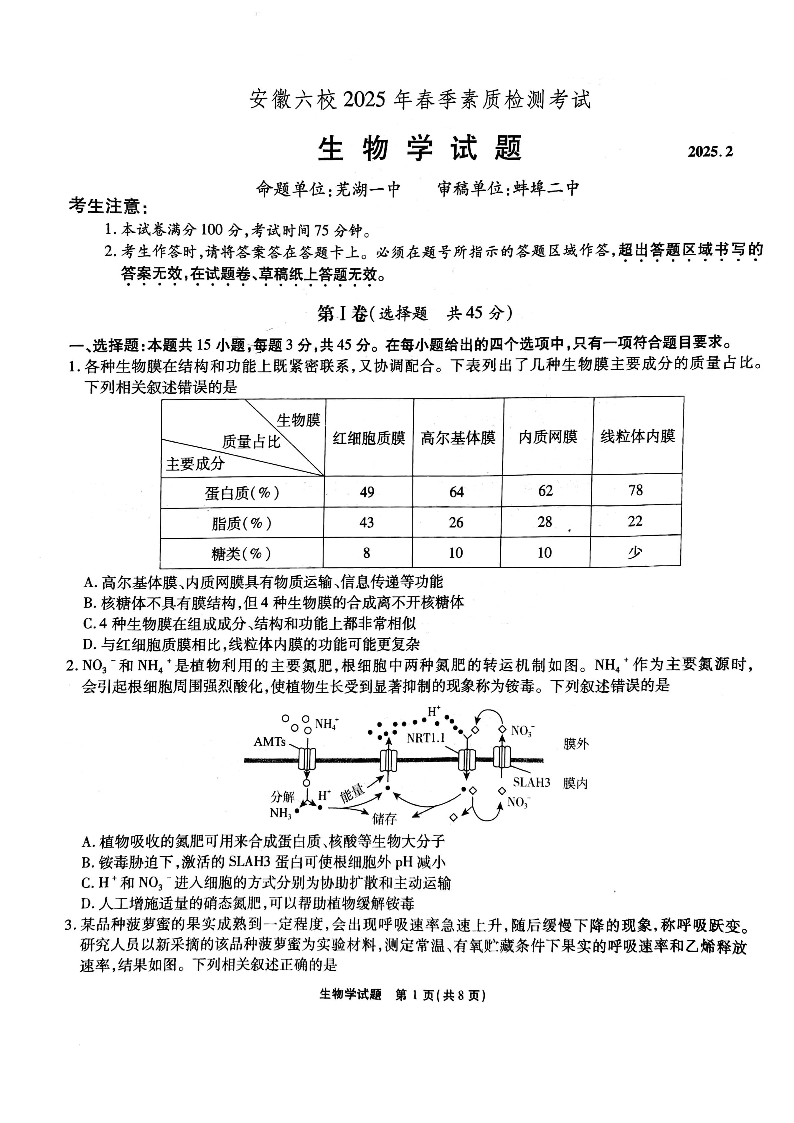 安徽省六校2025届高三下学期2月素质检测考试 生物.pdf