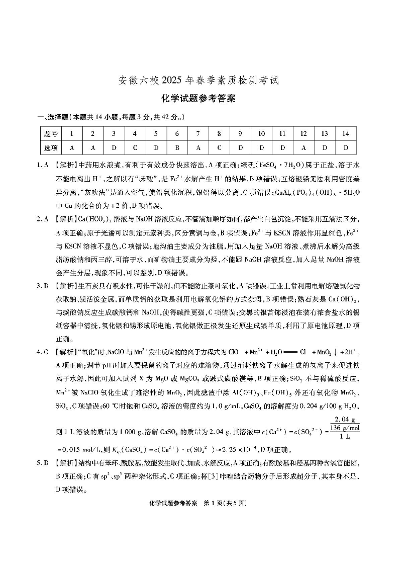 安徽省六校2025届高三下学期2月素质检测考试 化学答案.pdf