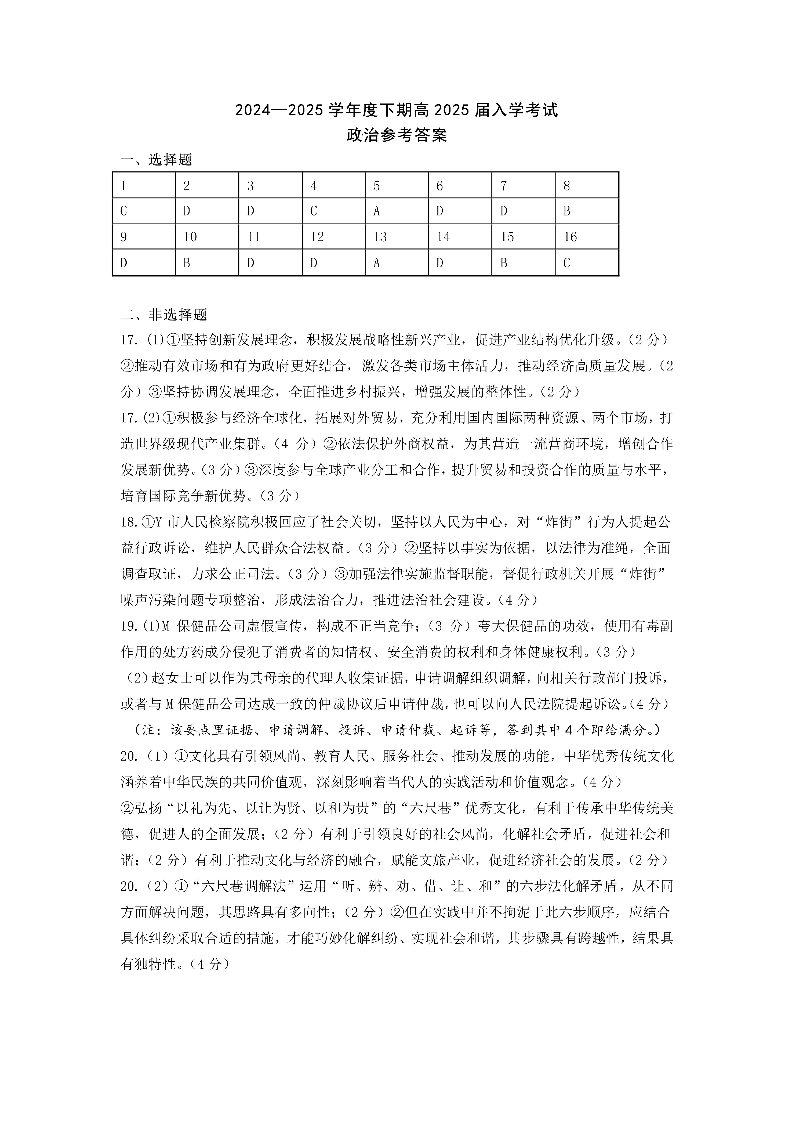 四川省成都市第七中学2025届高三下学期2月入学考试 政治答案.pdf