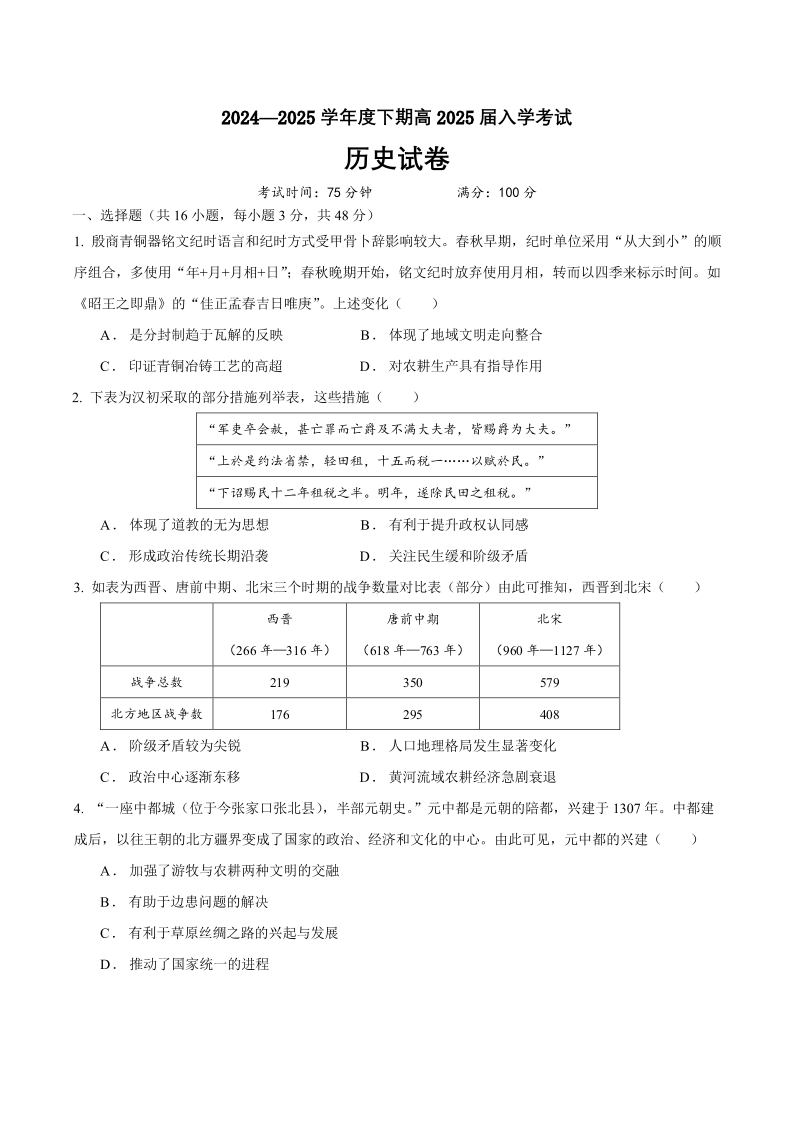 四川省成都市第七中学2025届高三下学期2月入学考试 历史.pdf