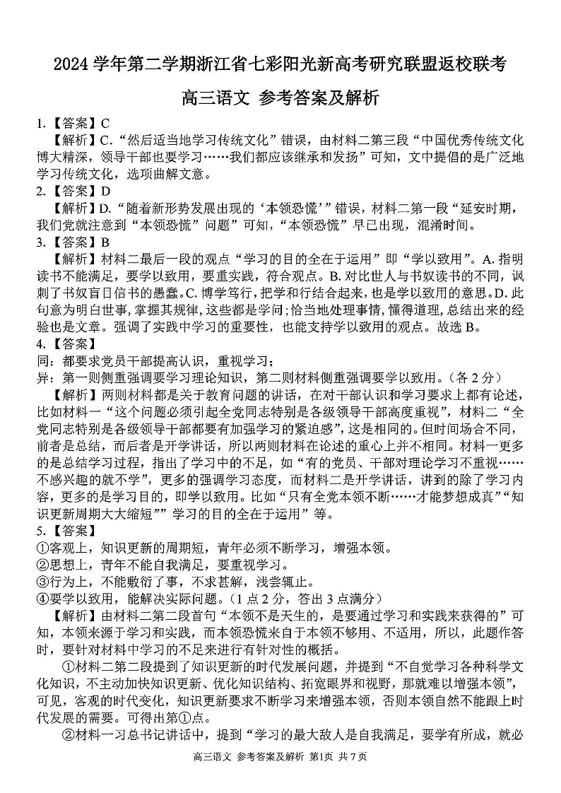 浙江省2024学年第二学期七彩阳光新高考研究联盟返校联考 语文答案.pdf