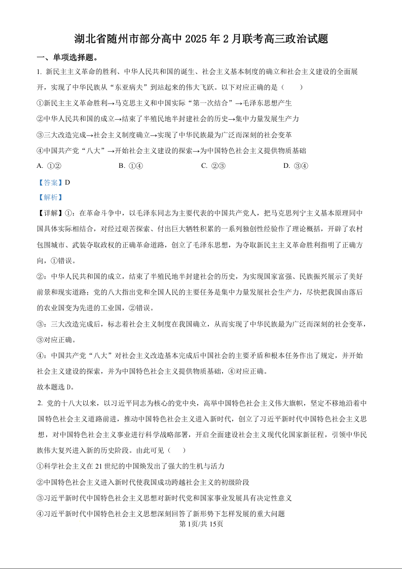 湖北省随州市部分高中2024-2025学年高三2月月考 政治答案.docx