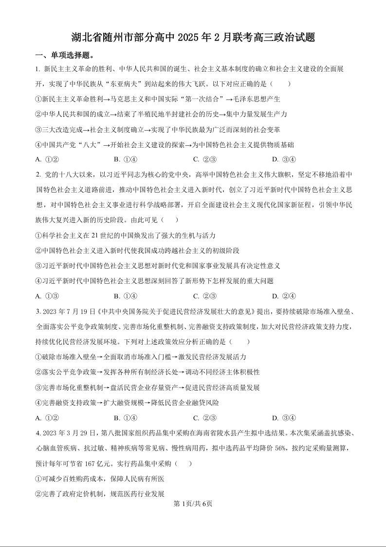 湖北省随州市部分高中2024-2025学年高三2月月考 政治.docx