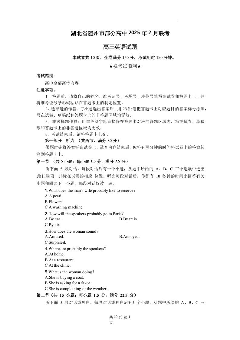 湖北省随州市部分高中2024-2025学年高三2月月考 英语.docx