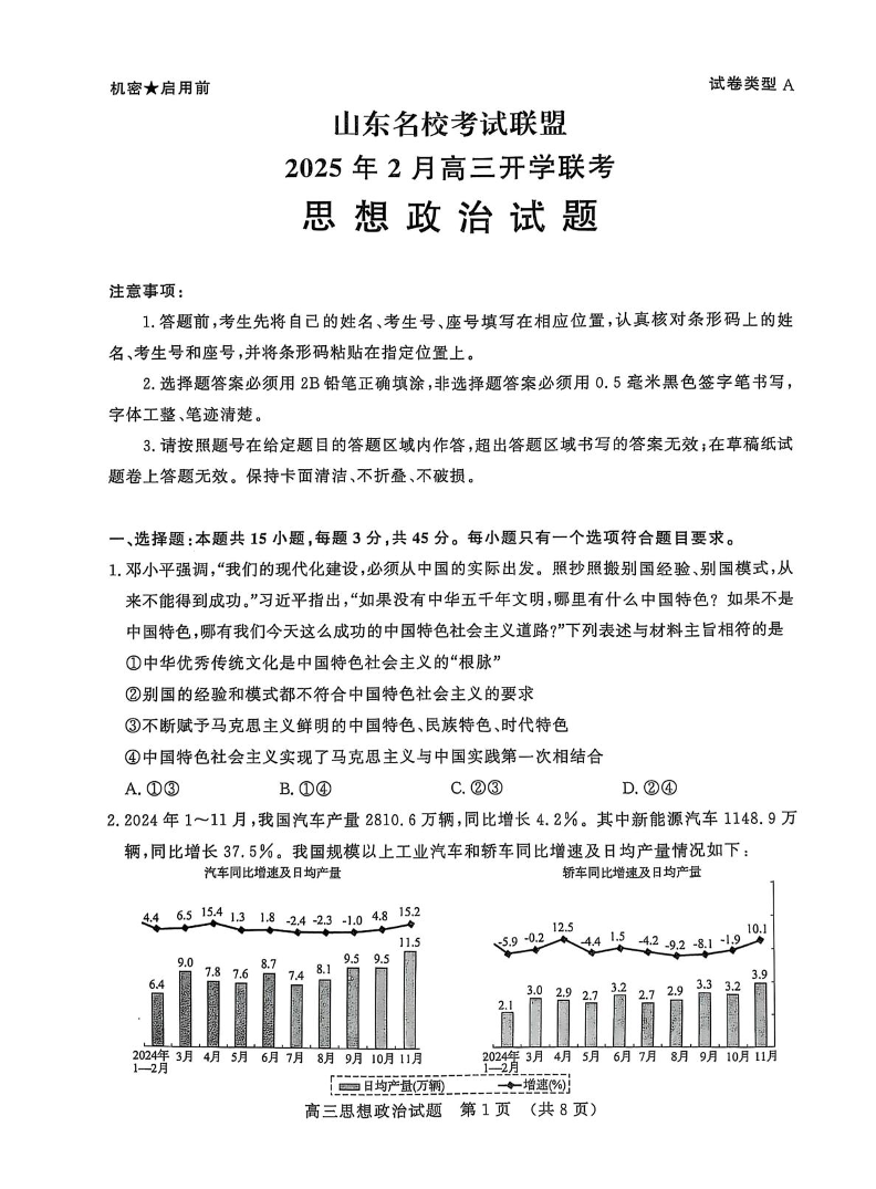 山东名校考试联盟2025年2月高三开学联考 政治.pdf