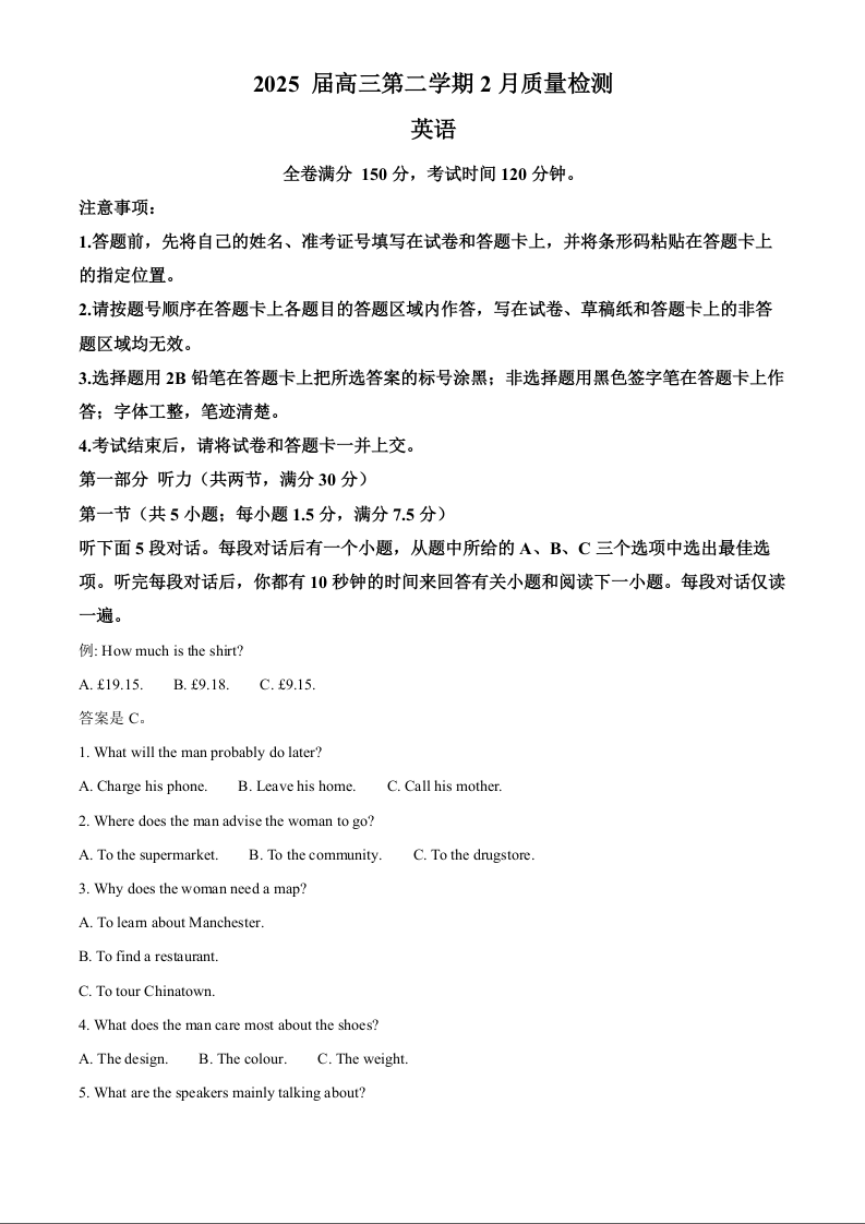 金科大联考2025届高三第二学期2月质量检测 英语(含答案).docx