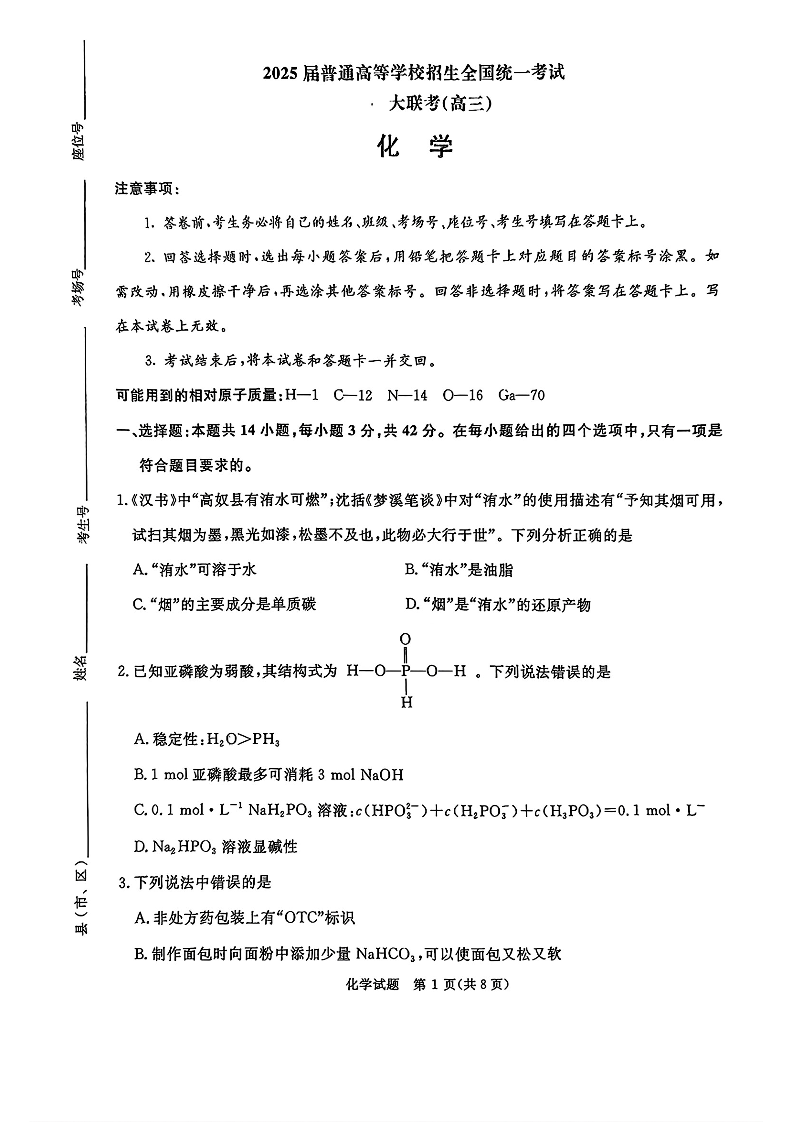河南省青桐鸣2025年2月高三下学期开学考试 化学(含答案).pdf