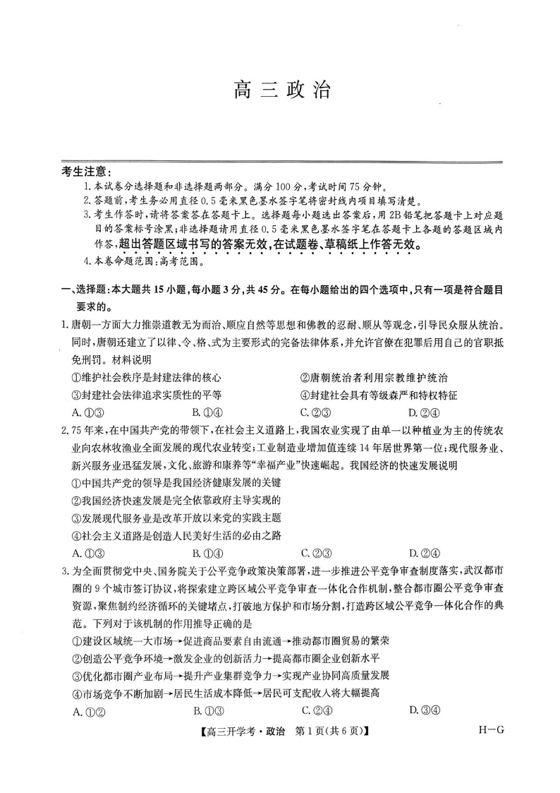 河南省九师联盟2024-2025学年高三下学期2月开学考试 政治(含答案).pdf