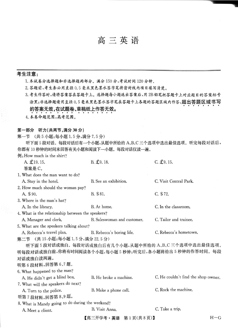 河南省九师联盟2024-2025学年高三下学期2月开学考试 英语.pdf