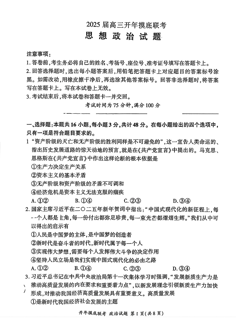 百师联盟2025届高三开年摸底联考 政治(含答案).pdf