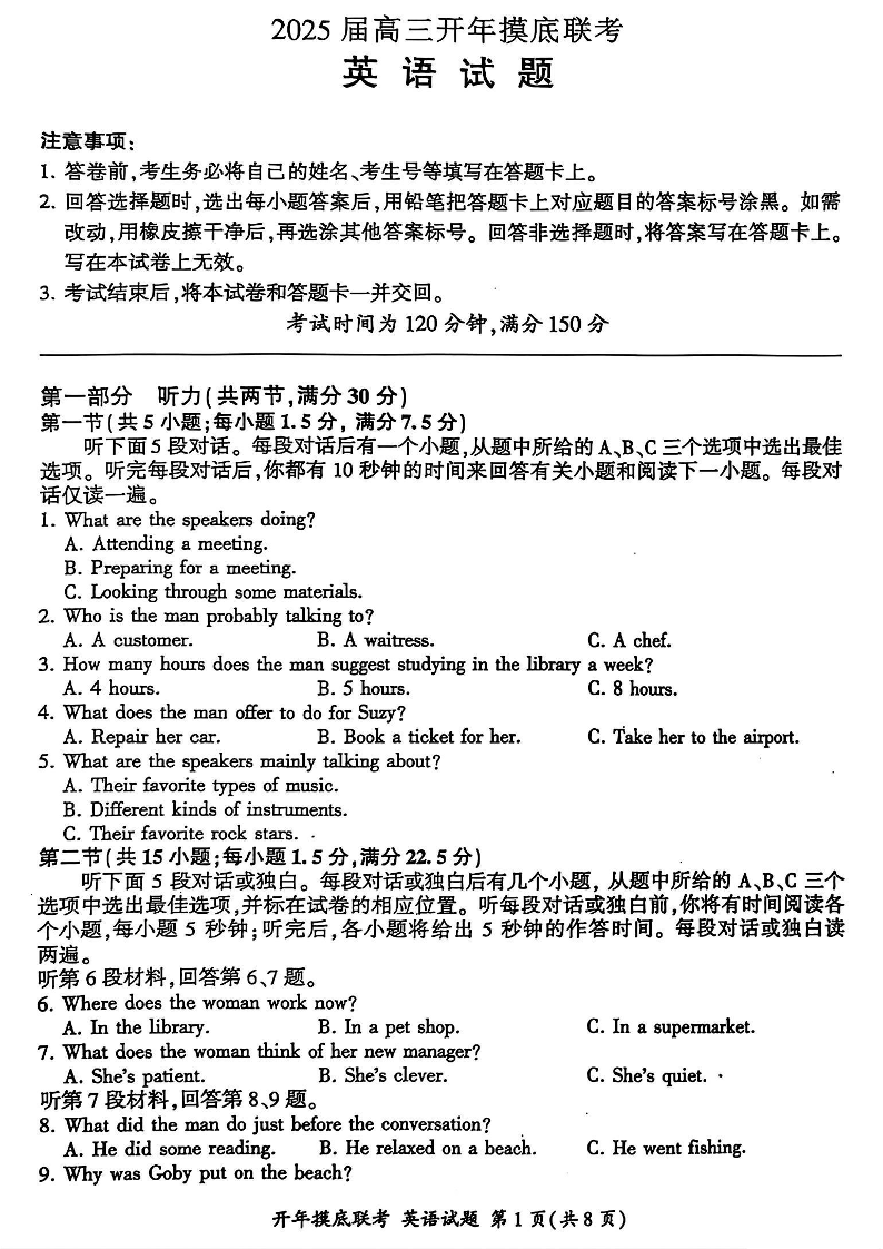 百师联盟2025届高三开年摸底联考 英语(含答案).pdf