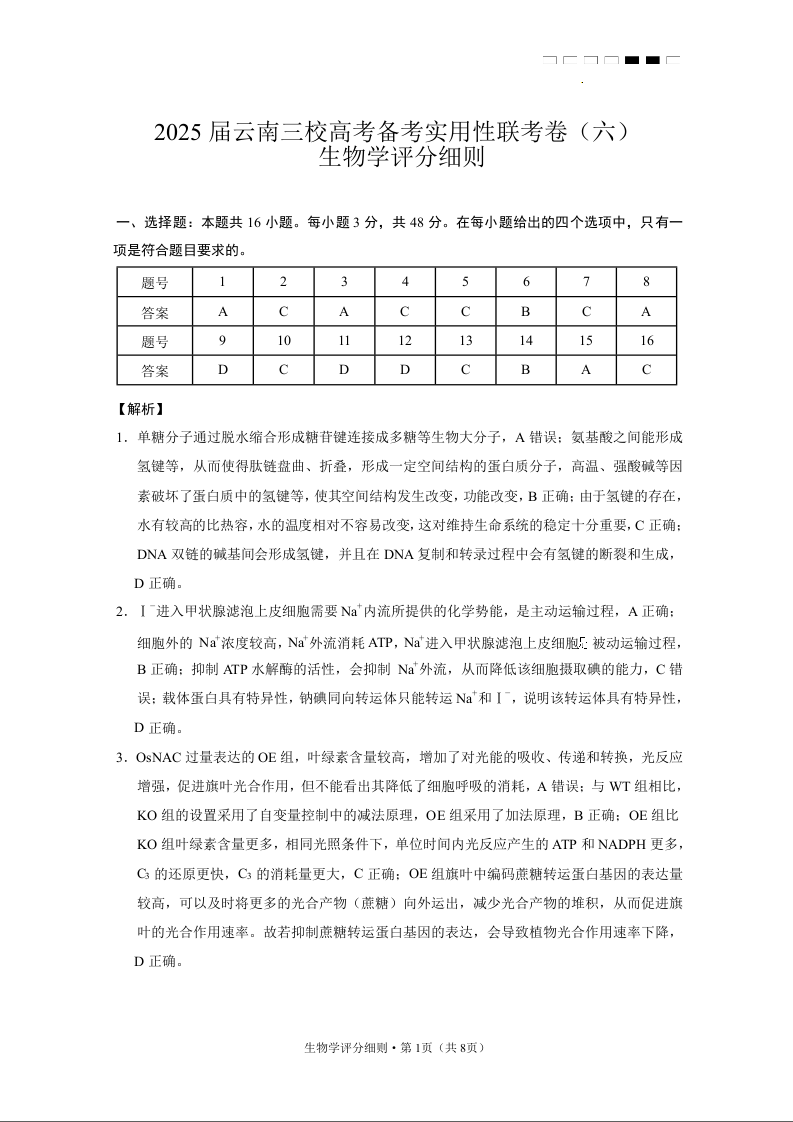 2025届云南三校高考备考实用性联考卷(六)生物答案.docx