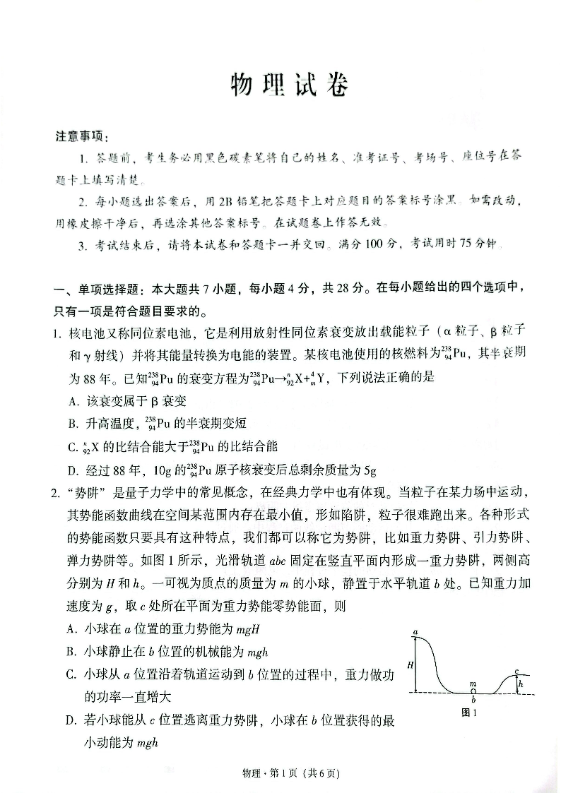 云南师范大学附属中学2025届高三下学期开学考试 物理.pdf