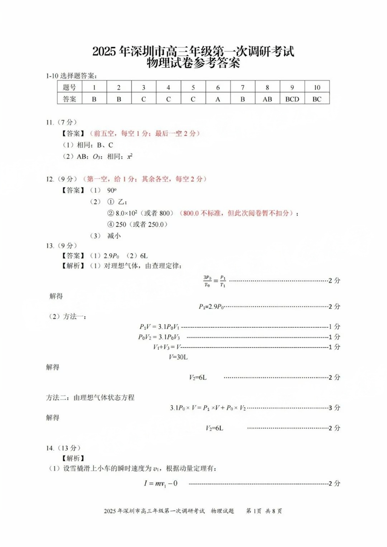 2025年深圳市高三年级第一次调研考试 物理答案.pdf