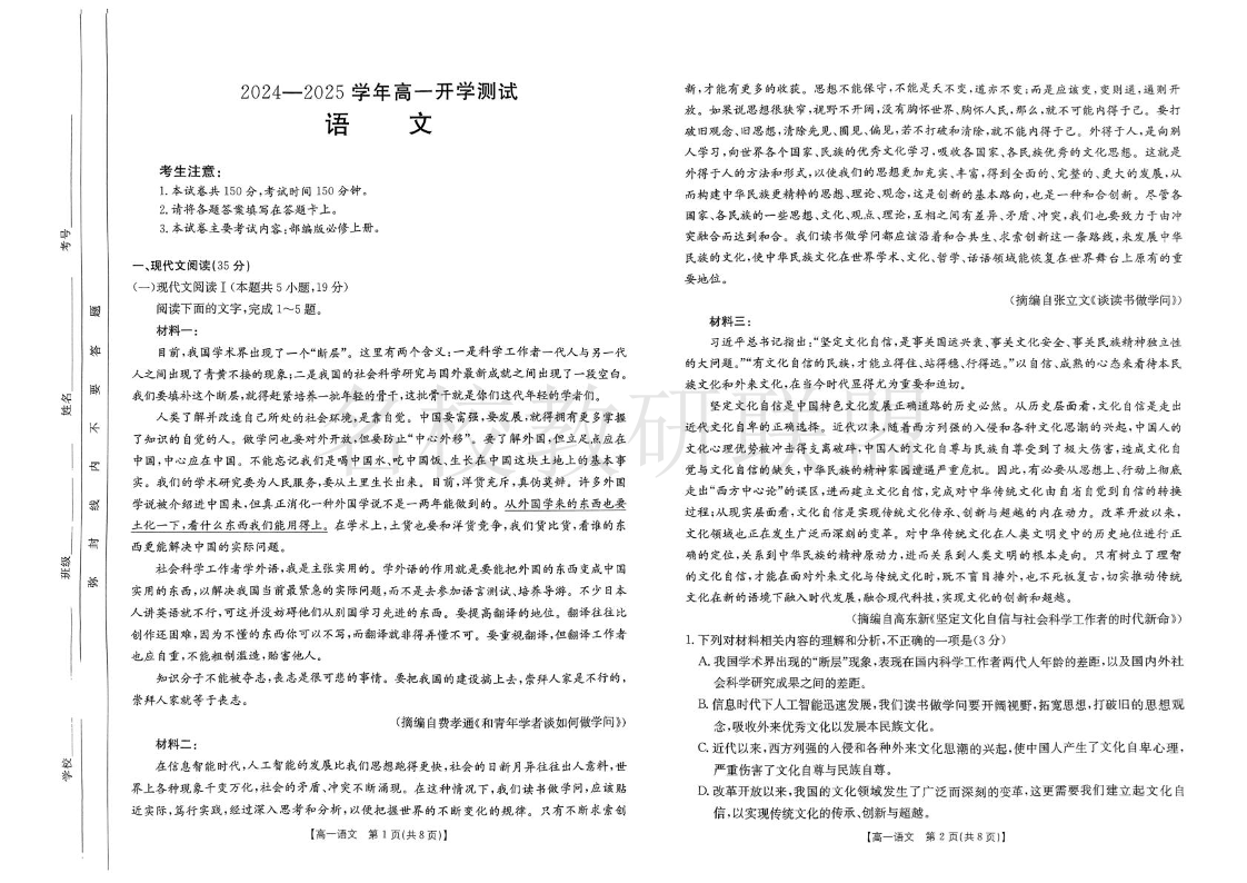 河南省名校大联考2024-2025学年高一下学期开学考试 语文.pdf