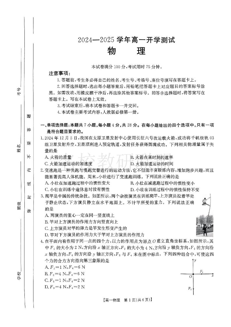 河南省名校大联考2024-2025学年高一下学期开学考试 物理.pdf