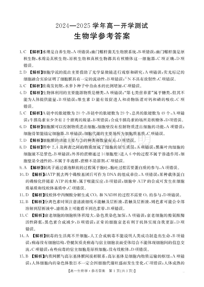 河南省名校大联考2024-2025学年高一下学期开学考试 生物答案.pdf