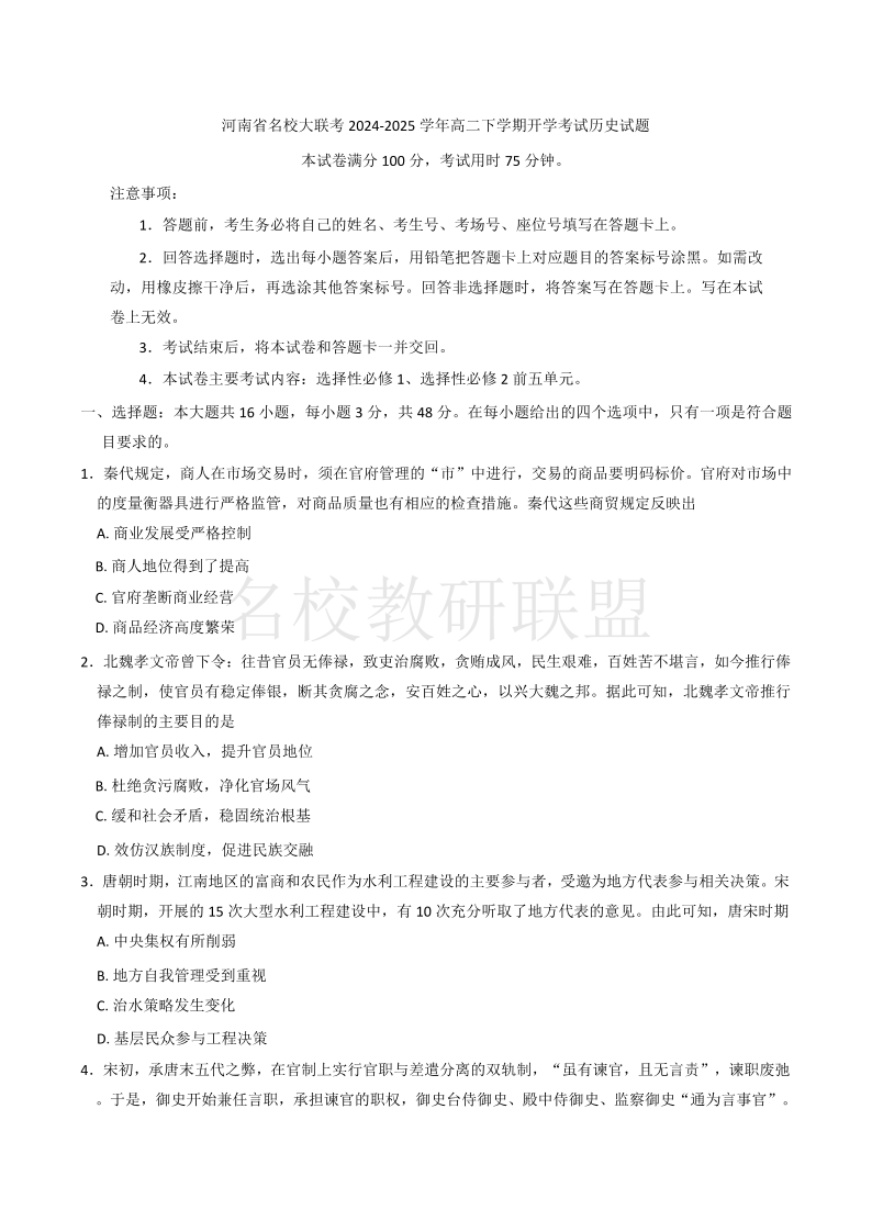 河南省名校大联考2024-2025学年高二下学期开学考试 历史(含答案).pdf