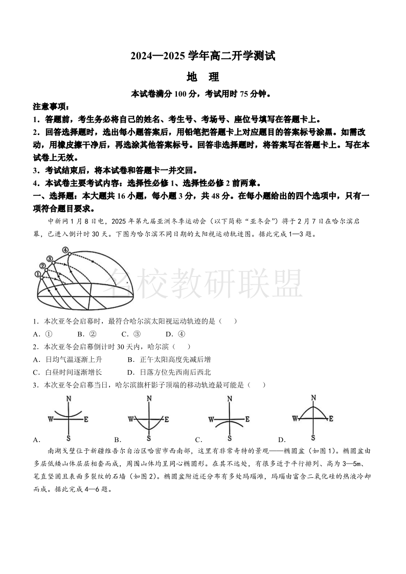 河南省名校大联考2024-2025学年高二下学期开学考试 地理(含答案).pdf
